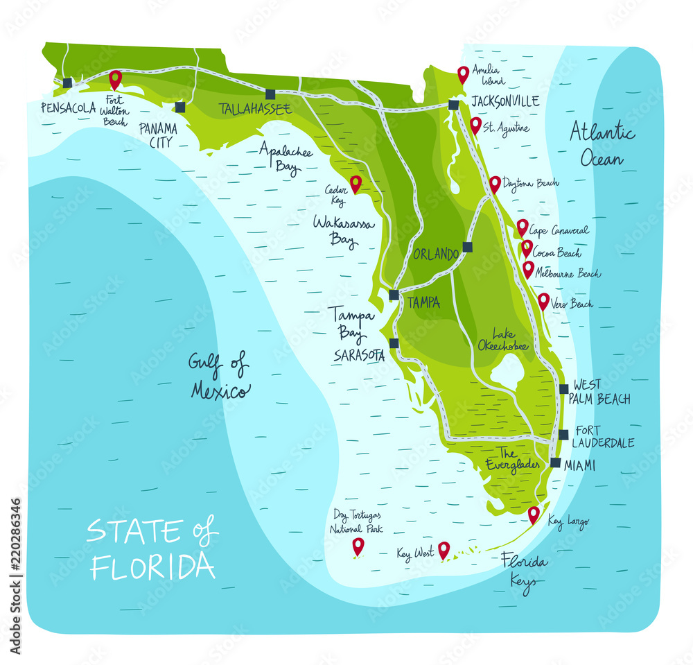 ImprimirHand Drawn map of the state of Florida with main cities